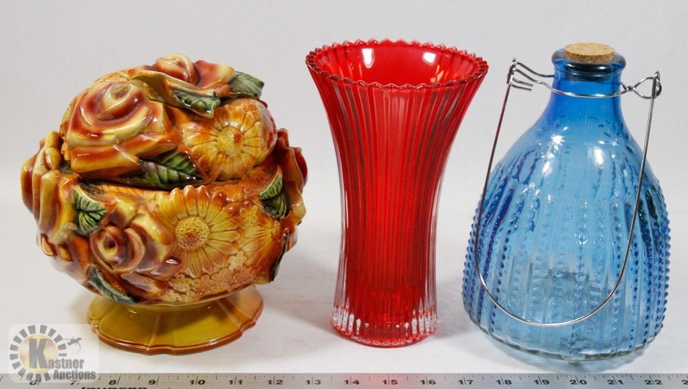 ROYAL BOUQUET BY UNICORN 1960'S COOKIE JAR, LARGE VINTAGE GLASS WASP TRAP BLUE IN COLOR, LARGE GLASS RIBBED VASE