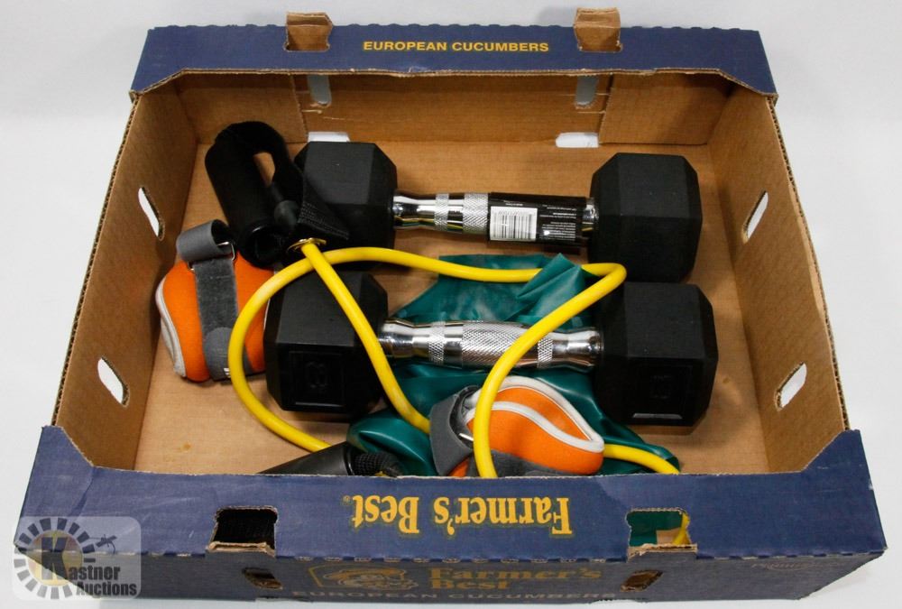 BOX OF WEIGHTS AND EXERCISE EQUIPMENT.