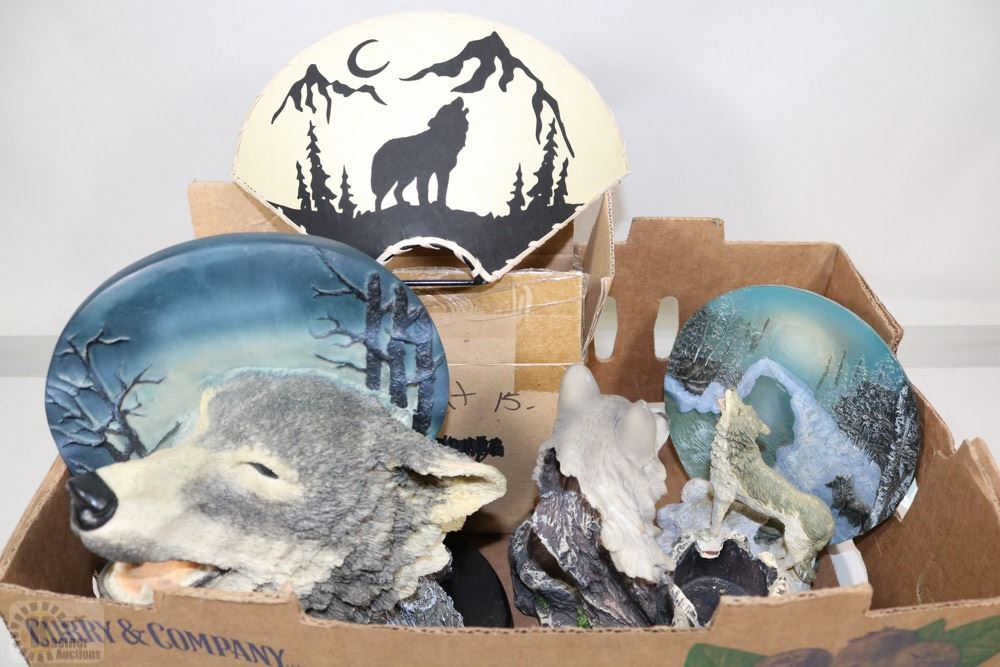 BOX OF WOLF ITEMS INCLUDING NEW WOLF WALL FIXTURE