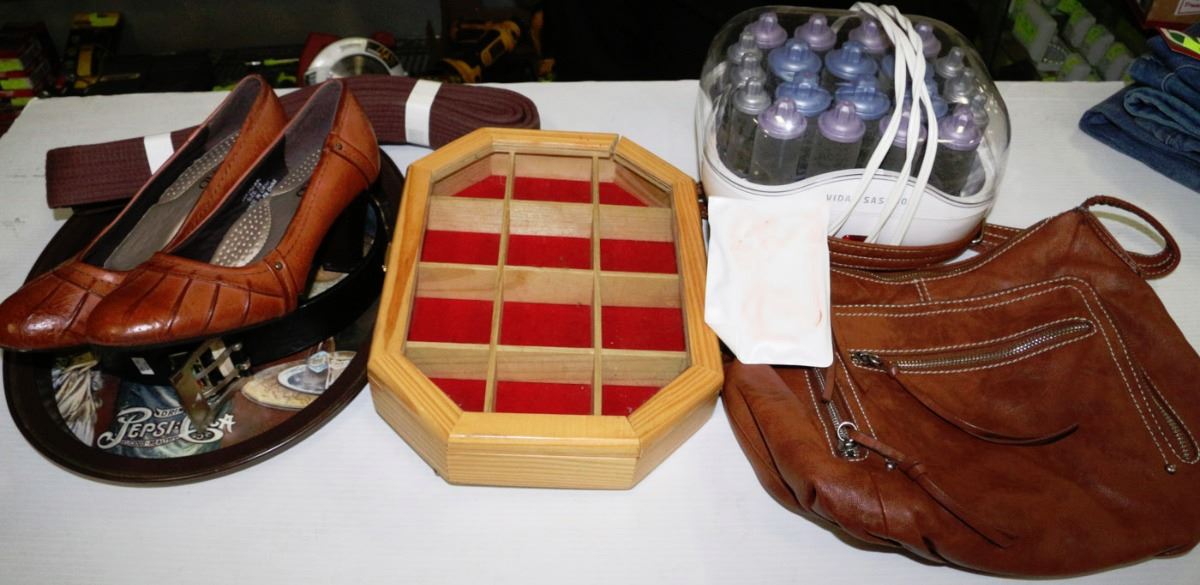 SIZE 39 (8) SHOES, CURLERS,DISPLAY BOX, AND COLLECTIBLE PEPSI COLA TRAY