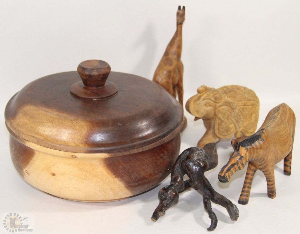 WOODEN BOWL W/LID, ELEPHANT, GIRAFFE, ETC.