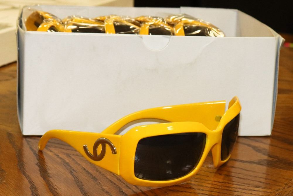 BOX OF YELLOW DESIGNER SUNGLASSES.