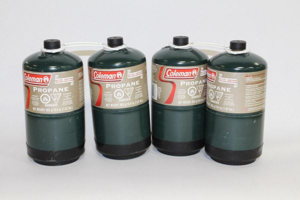 BOX W/ 4 NEW 1.02LB COLEMAN PROPANE BOTTLES - FULL