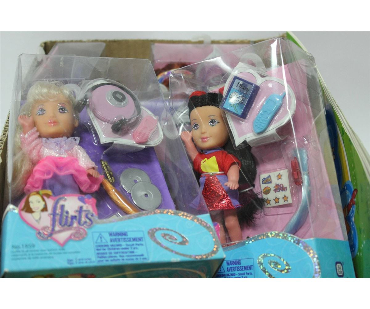 BOX W/ 6 NEW FLIRT DOLLS IN BOXES ETC..