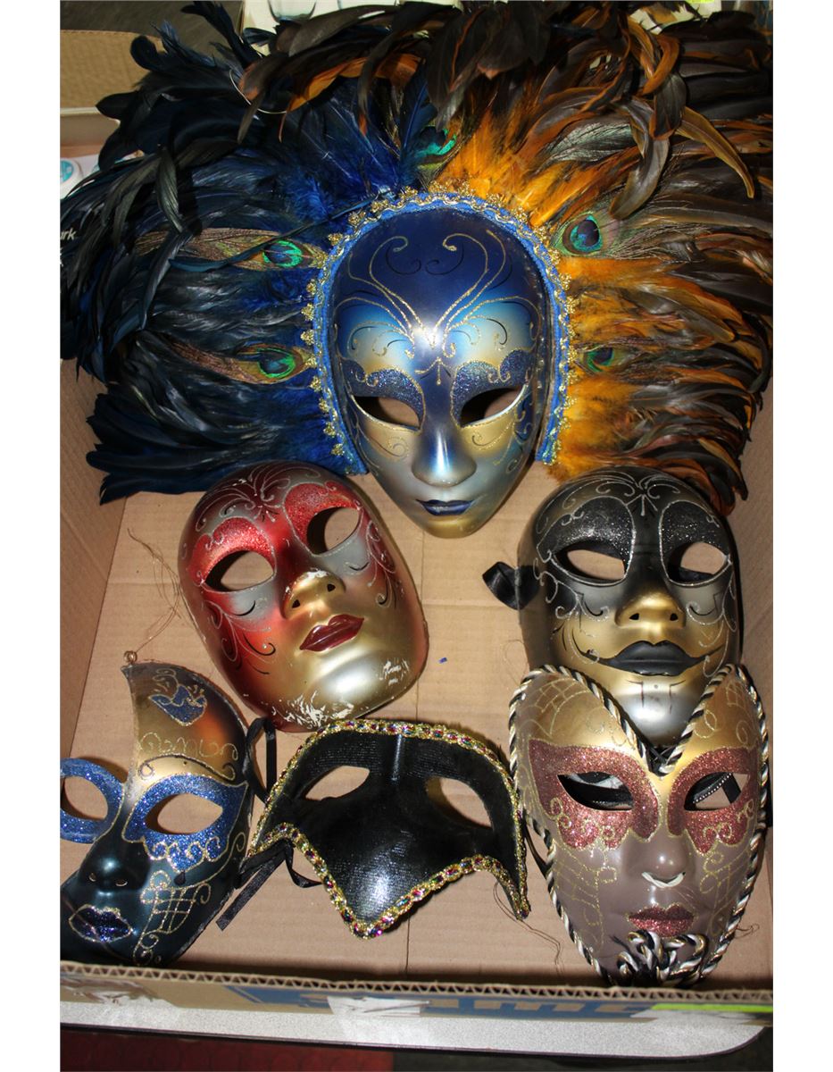 BOX W/ 7 DECORATIVE WALL HANGING MASKS
