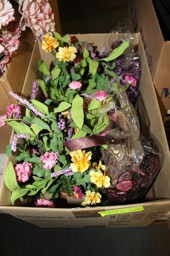 BOX W/ ARTIFICIAL FLOWER ARRANGEMENTS ETC