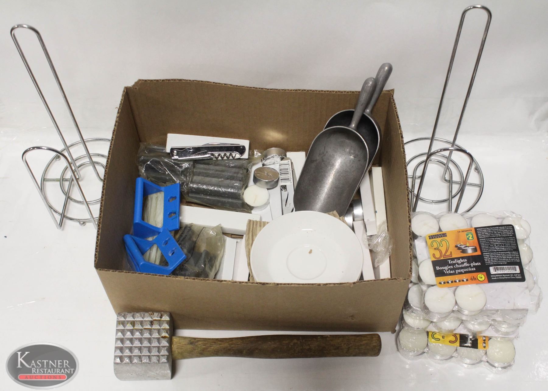 ALUMINUM BROWNE SCOOPS, NEW BAR TOOLS(BOTTLE OPENER, WINE CORKER) MEAT MALLET, 4" SAUCER PLATES, PAPERTOWEL HOLDERS, TAG HOLDERS(FOR GREEN METRO RACKS)