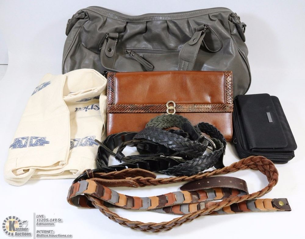 BOX W/ ASST PURSES, BAGS, AND BELTS