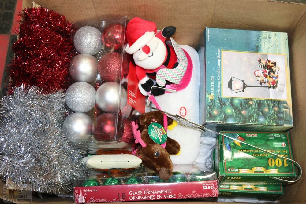 SANTA & REINDEER SLEIGH, BULBS, CANDLE LAMP SCENE, 2 BOXES OF MINIATURE LIGHTS, ETC.
