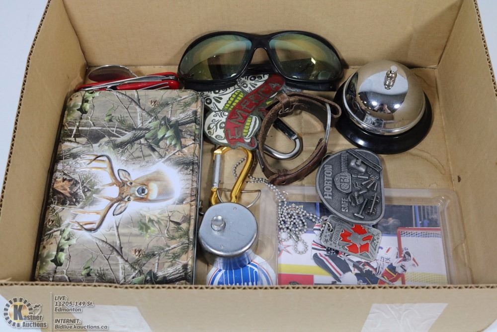 KNIFE, DEER PLAYING CARDS IN TIN CASE, SKULL HEAD BUCKLE, PATRICK KANE HOCKEY CARD, ETC.