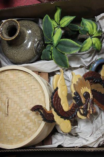 BOX W/ DIM SUM COOKER, VASE, WOOD CARVING, ETC.