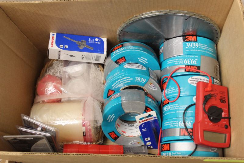 BOX W DUCT TAPE/MULTIMETER/HALOGEN BULBS ETC