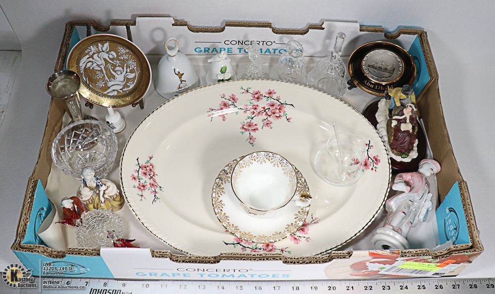 ENGLISH PLATTER, COLLECTIBLE BELLS, FIGURINES, ROYAL ALBERT HAPPY BIRTHDAY TEA CUP SET, ETC. - COLLECTIBLES