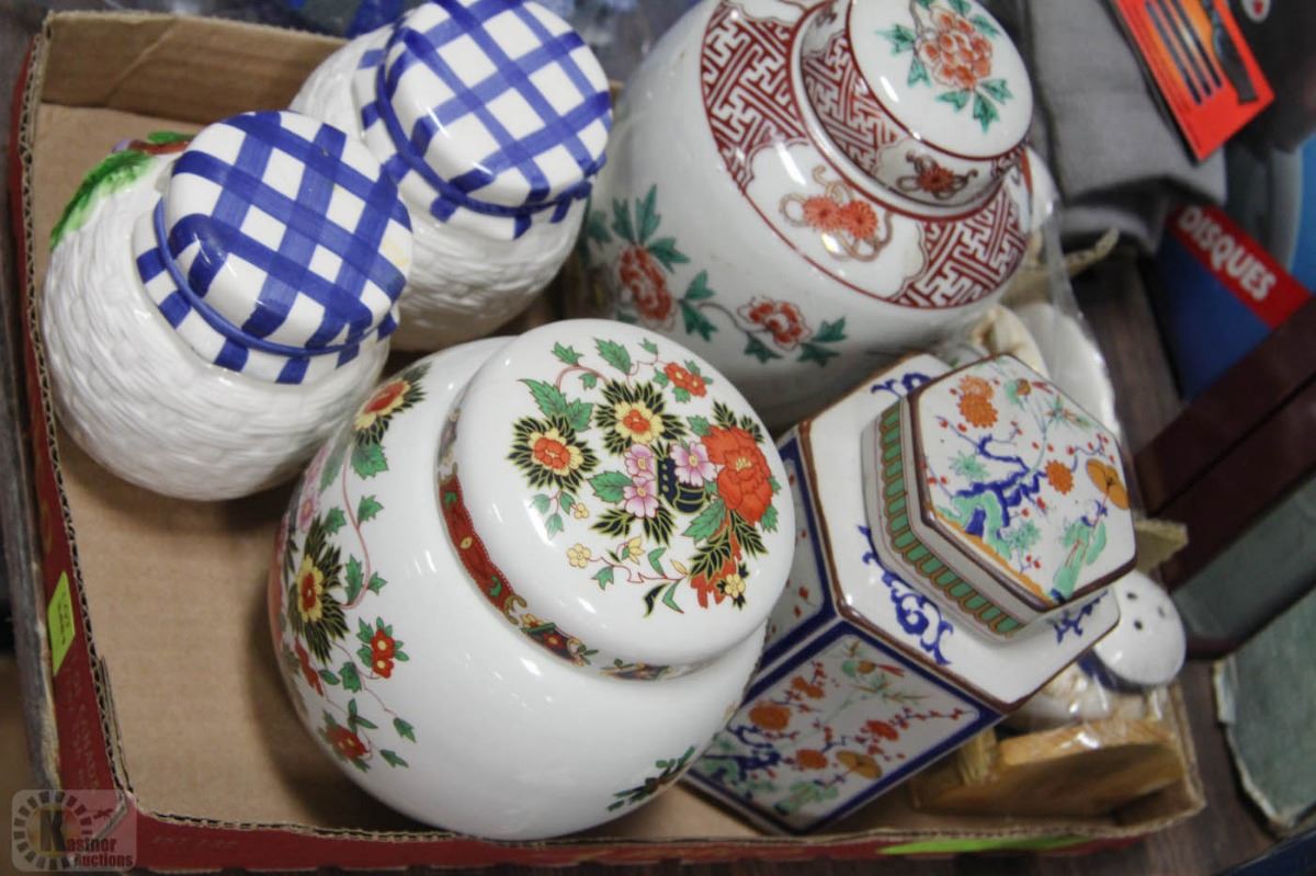BOX W/ GINGER JARS, KITCHEN SET, CREAM + SUGAR