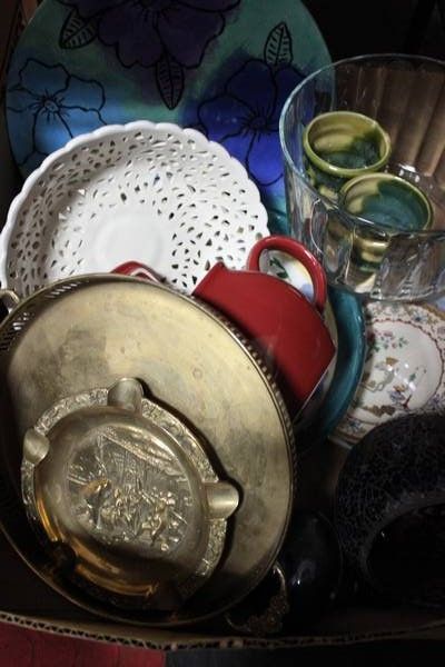 BOX W/ HOUSEHOLD DECORATIVE PLATTERS, PLATES, ETC.