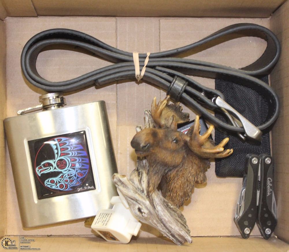 DAVIDSON ZIPPO, CABELA'S MULTI-TOOL, MOOSE HEAT NIGHTLIGHT & QUICK SILVER LEATHER BELT