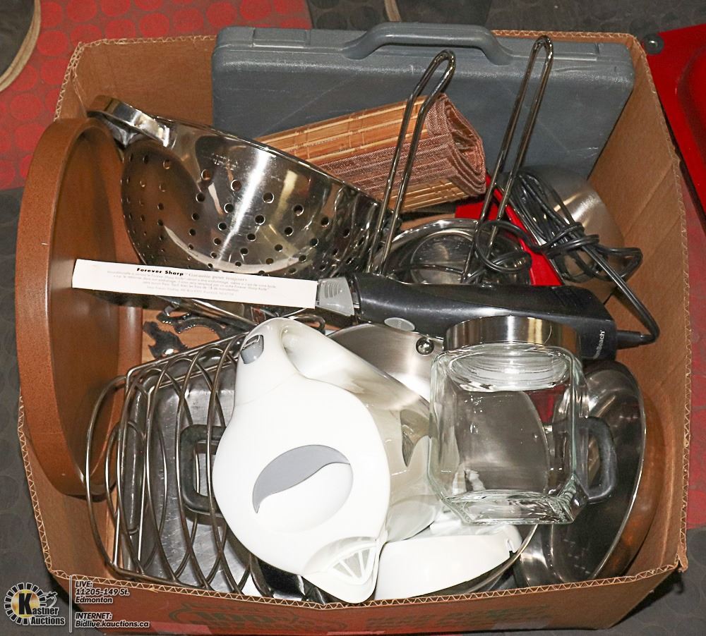 BOX W/ KITCHENWARE INCL. ELECTRIC KNIFE,