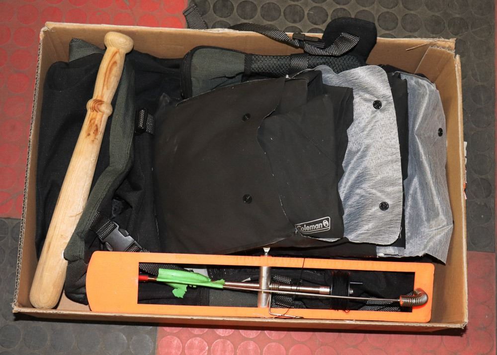 BACKPACK, 2 COLEMAN COMPLETE RAINSUITS SIZE M/L, FISH BONKER AND POP-UP FISHING REEL - GENERAL, OUTDOORS