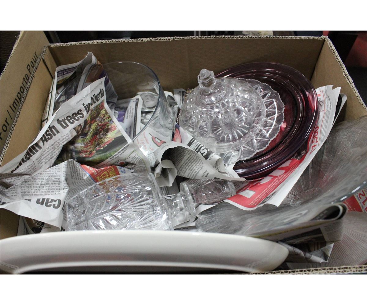 BOX W/ LIQUOR DISPENSOR,PLATTERS,COOKWARE ETC..