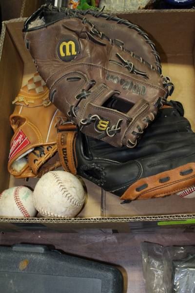 LEATHER BASEBALL GLOVES, BATTING GLOVES & 2 BASEBALLS