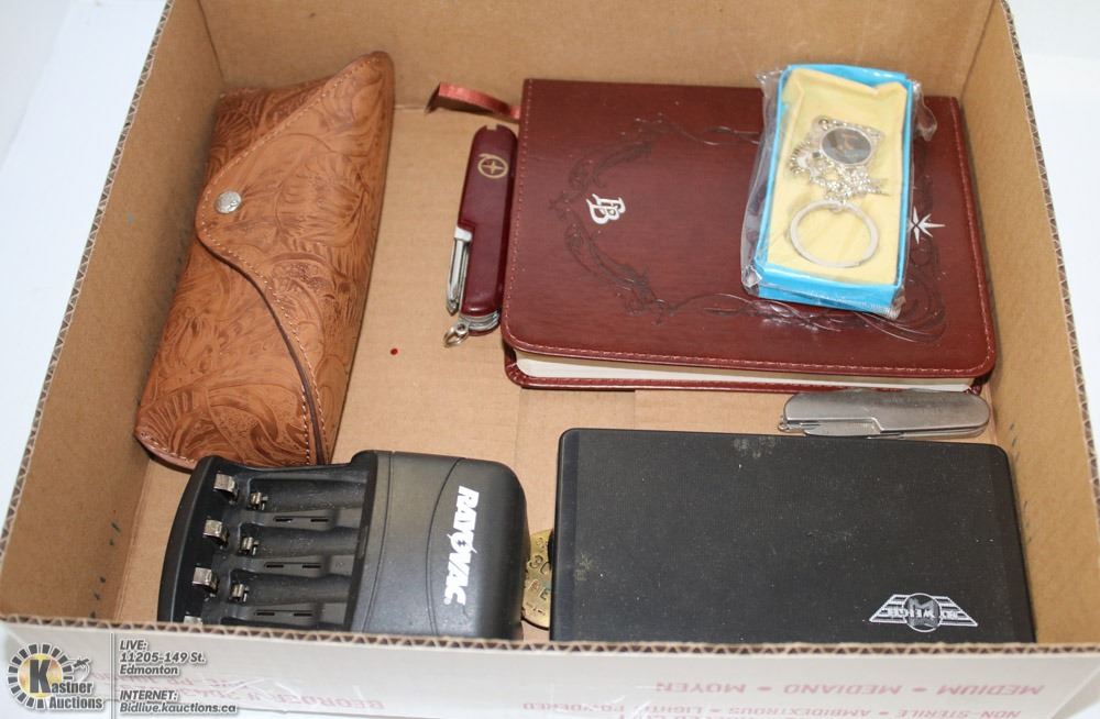 JOURNAL BOOK, SCALE, 1955 CHAUFFEUR PIN, SWISS-STYLE POCKET KNIFE, BATTERY CHARGER, ETC.