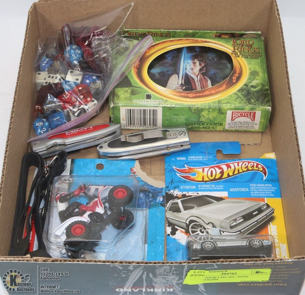 LORD OF THE RINGS PLAYING CARDS, GAMING DICE W/BAG, 2 SERRATED POCKET KNIVES, HOTWHEELS "BACK TO THE FUTURE TIME MACHINE" CAR ON CARD, ETC. - COLLECTIBLE