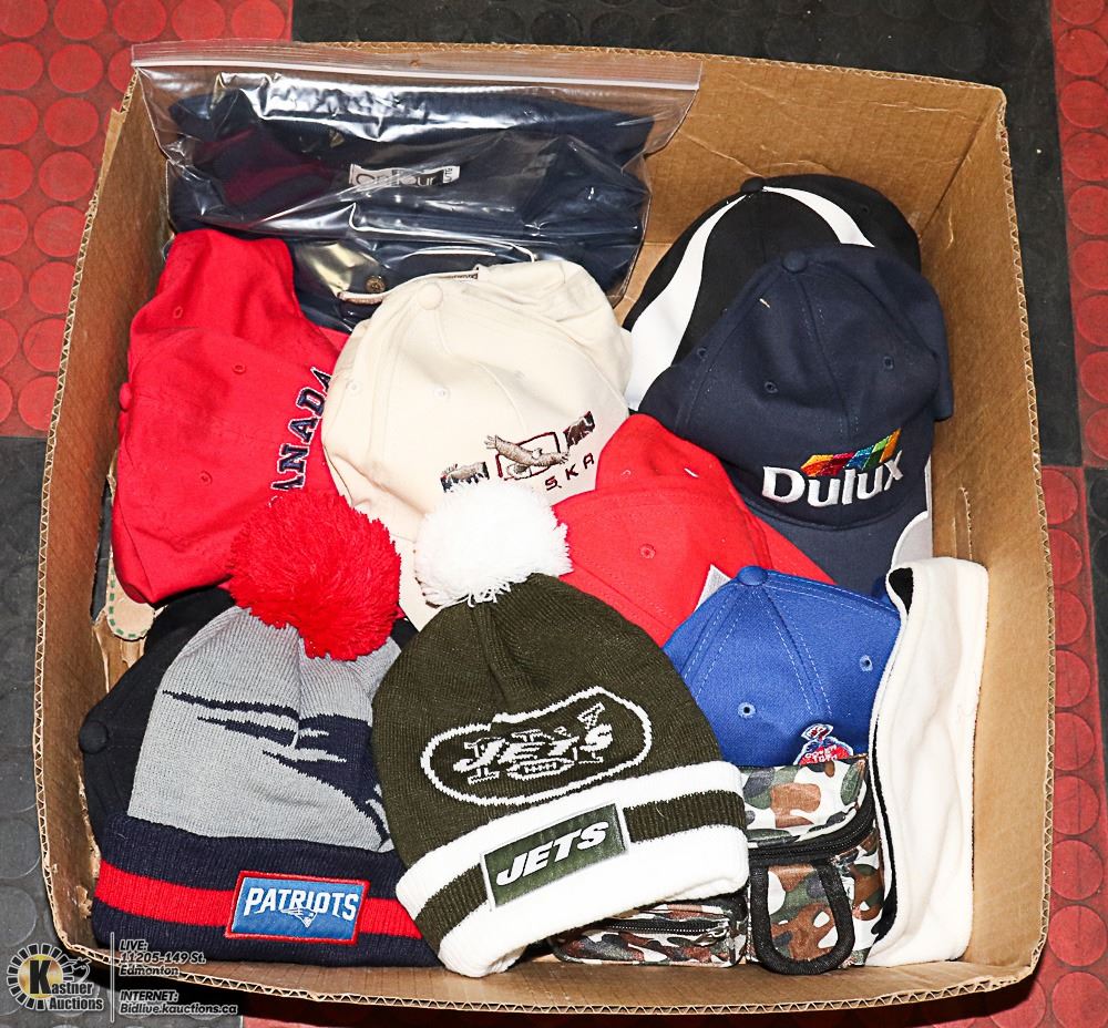W/TAGS, 7 BASEBALL CAPS INCL. CAPTAIN MORGAN, ALASKA, CANADA, ETC, CAMO FANNY PACK AND 2 NFL TOQUES: N.E. PATRIOTS AND N.Y. JETS - CLOTHING