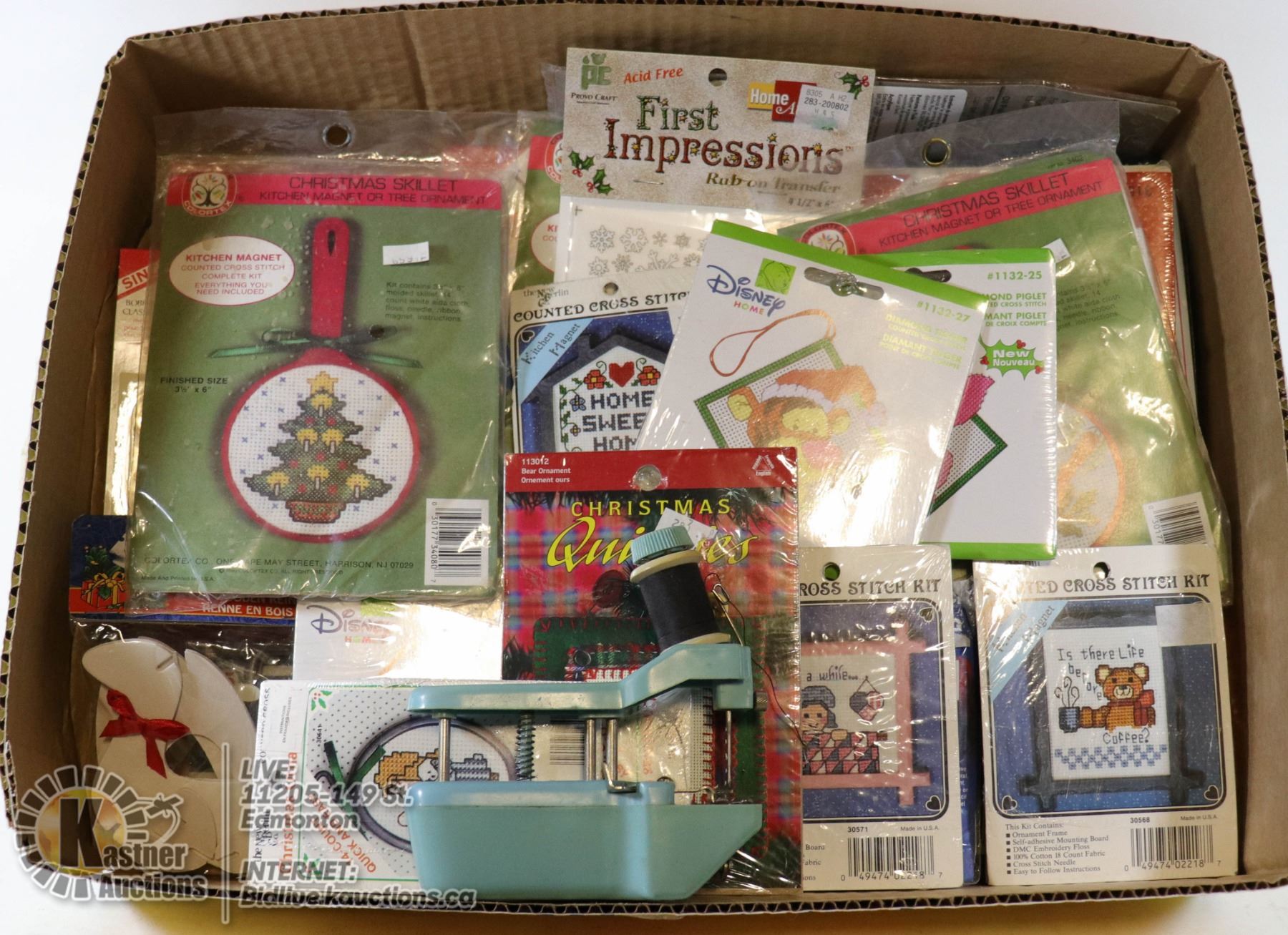 BOX W/ OVER 30 NEW CROSS STITCH KITS AND CRAFTS.
