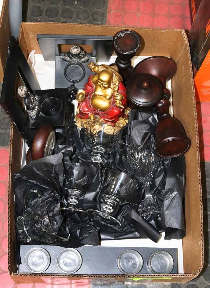 WINE GLASS, BUDDHA FIGURINES, LAUGHING BUDDHA FIGURINE, CANDLE HOLDERS, ETC. - HOUSEHOLD