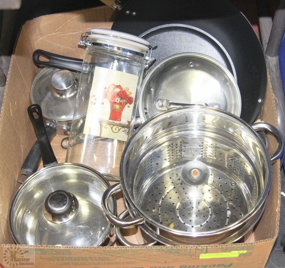 BOX W/POTS & PANS W/LIDS