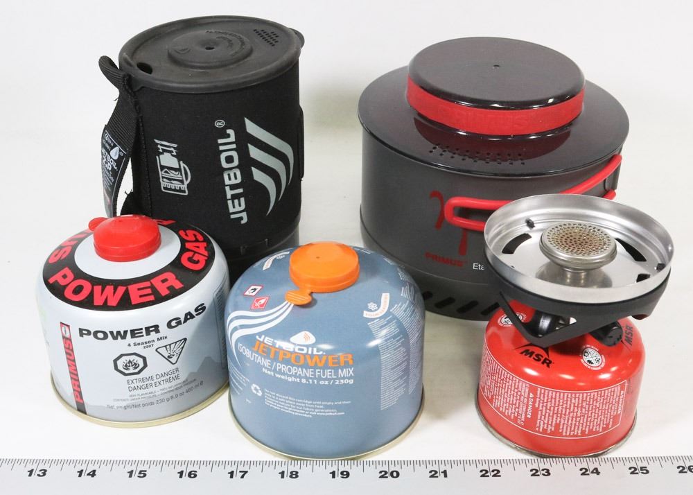 JET BOIL STOVE & CUP, PRIMUS LIGHT TITANIUM POT, 3 MINI PROPANE CANISTERS. CAMPING