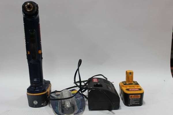 BOX W/ RYOBI DRILL, LED TAP LIGHT, ETC.