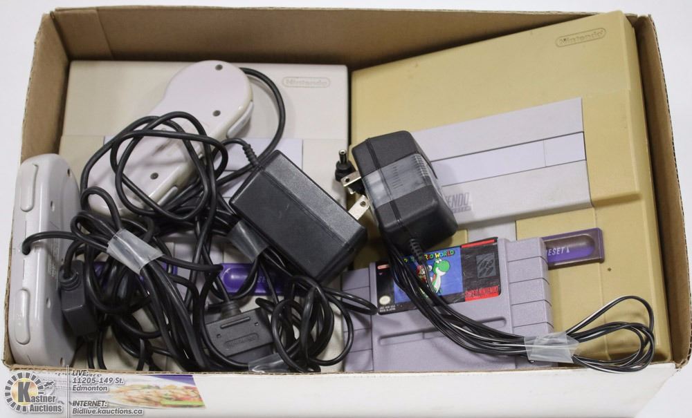 BOX W/ SUPER NINTENDO CONSOLES, 1 COMPLETE WITH 2