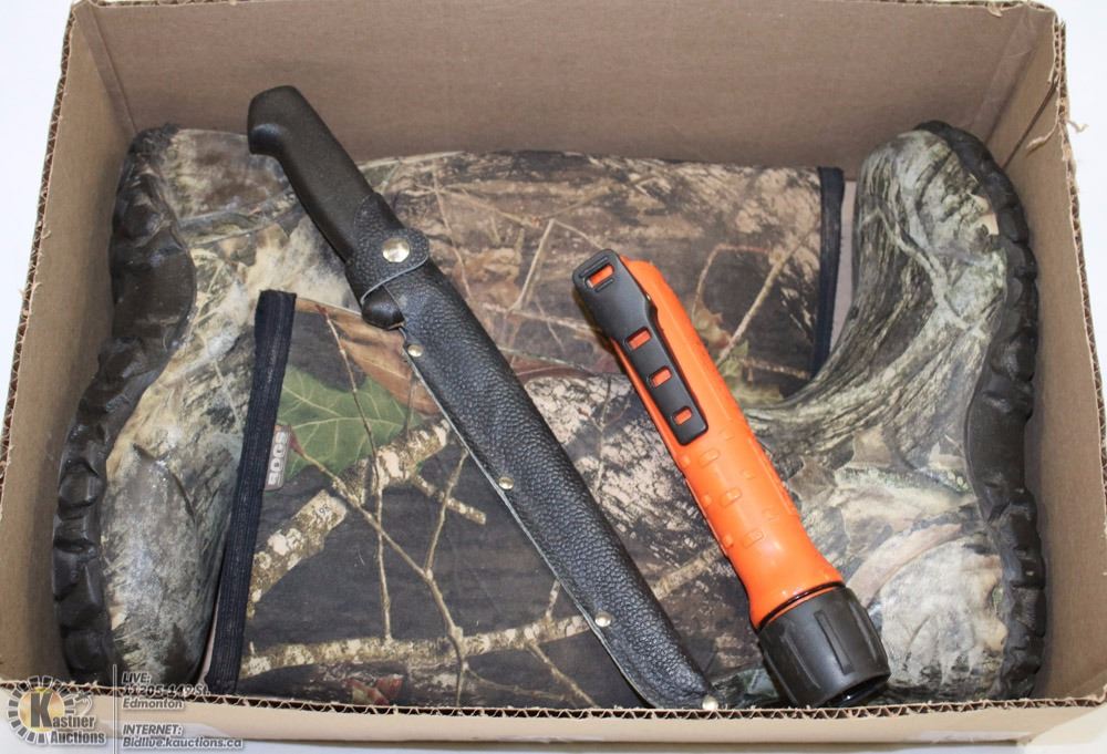 SHEATH, WATERPROOF FLASHLIGHT & BOGS CAMO MEN'S SIZE 10 FISHING BOOTS