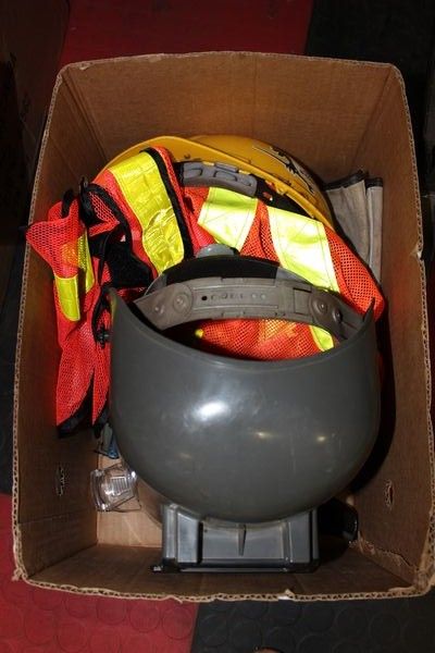 BOX W/ WELDING MASK, HARD HAT, VEST, WORK SUPPLIES