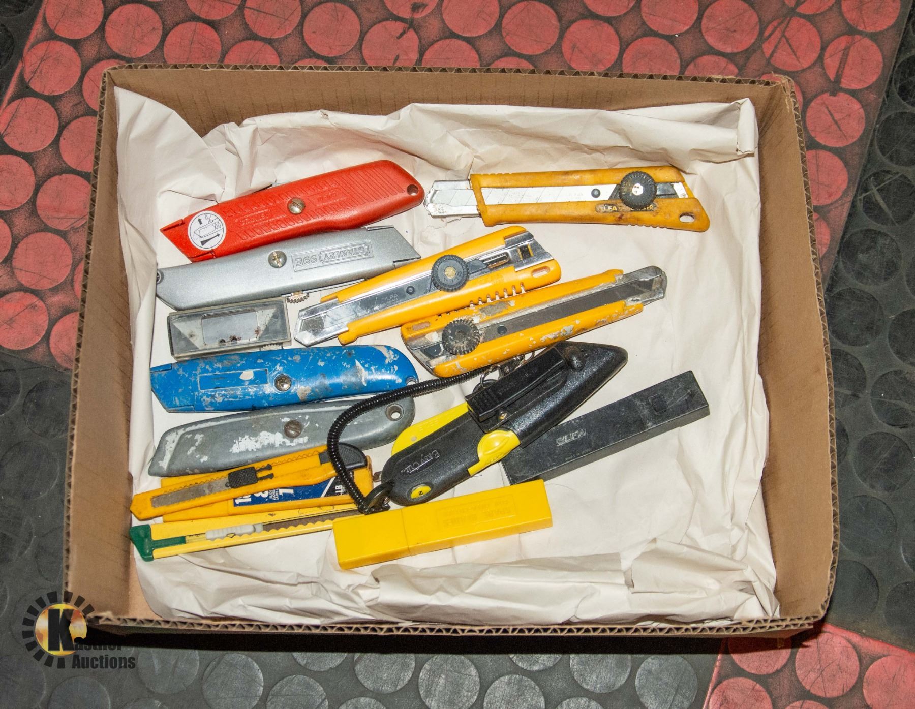 BOX WITH 10 VARIOUS KNIVES WITH NEW BLADES,