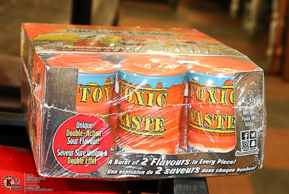 BOX WITH 12 42G DRUMS OF TOXIC WASTE SOUR CANDYS