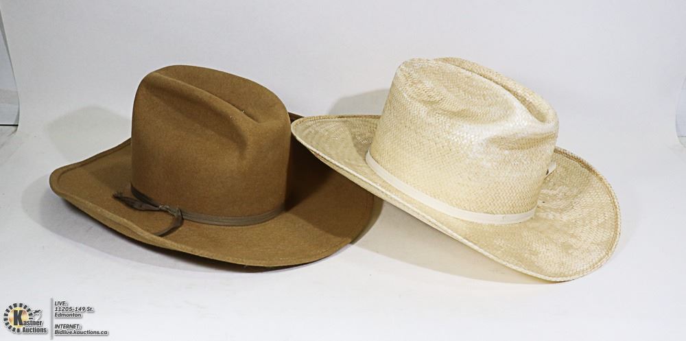 STRAW HAT WITH FEATHERS AND SIZE 6 1/2 LANNING LIGHT BROWN FELT COWBOY HAT - GENERAL, CLOTHING
