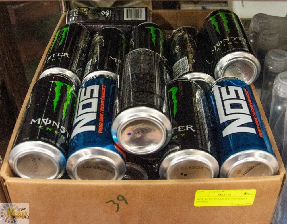BOX WITH 39 ASSORTED ENERGY DRINKS