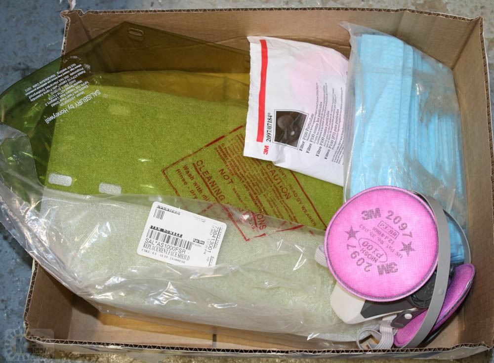 BOX WITH 3M RESPIRATOR PRODUCTS AND VISOR SHIELDS