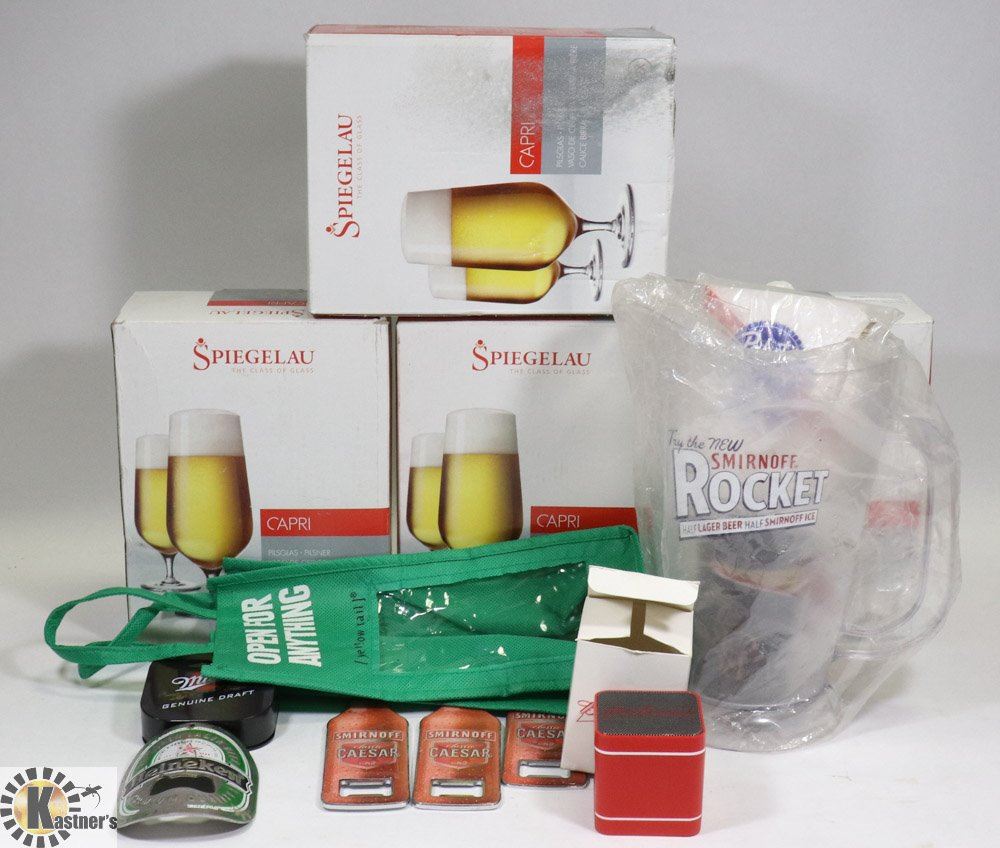 BEER GLASSES (MADE IN GERMANY), SMIRNOFF ROCKET PITCHER & BOTTLE OPENERS, NEW BUDWEISER SPEAKER IN BOX, NEW MILLER BEER EARBUDS W/CHARGING CORD, ETC. - GENERAL, HOUSEHOLD