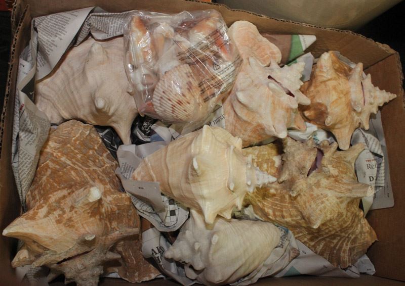 BOX WITH 7 LARGE CONCH SHELLS & SMALLER SHELLS