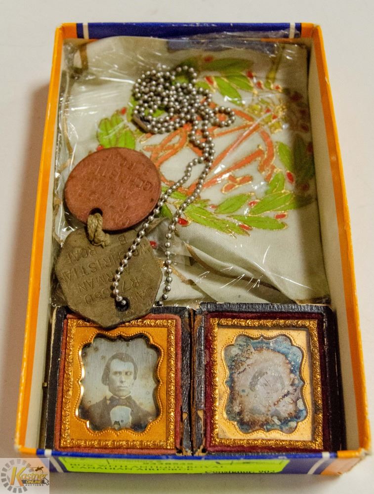 DOG TAGS, A ROYAL CANADIAN AIRFORCE SWEETHEART HANKERCHIEF & 2 ANTIQUE TIN PLATE PICTURES IN LEATHER CASES