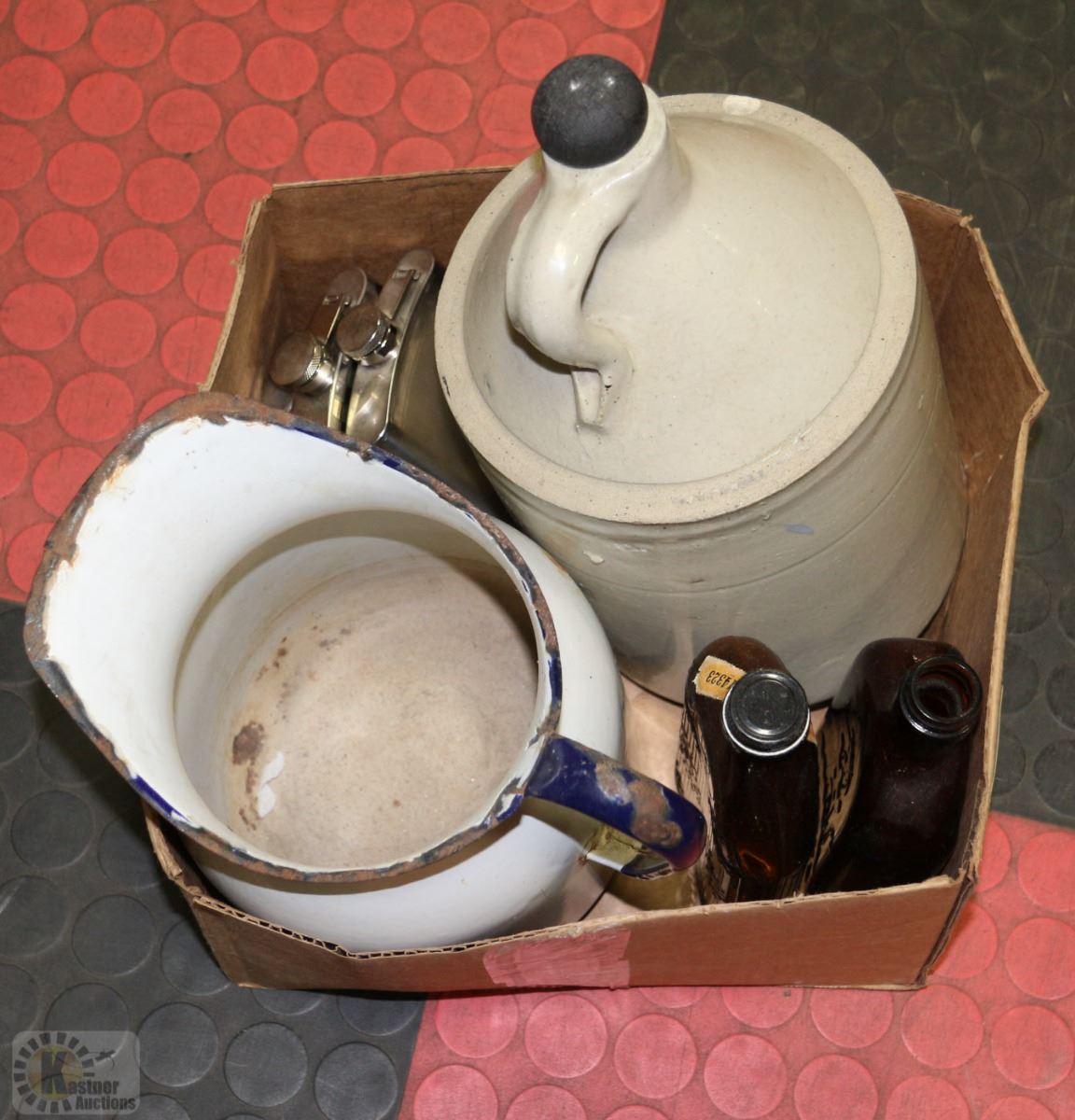 PITCHER, WHISKEY DISPENSER AND 2 BOTTLES