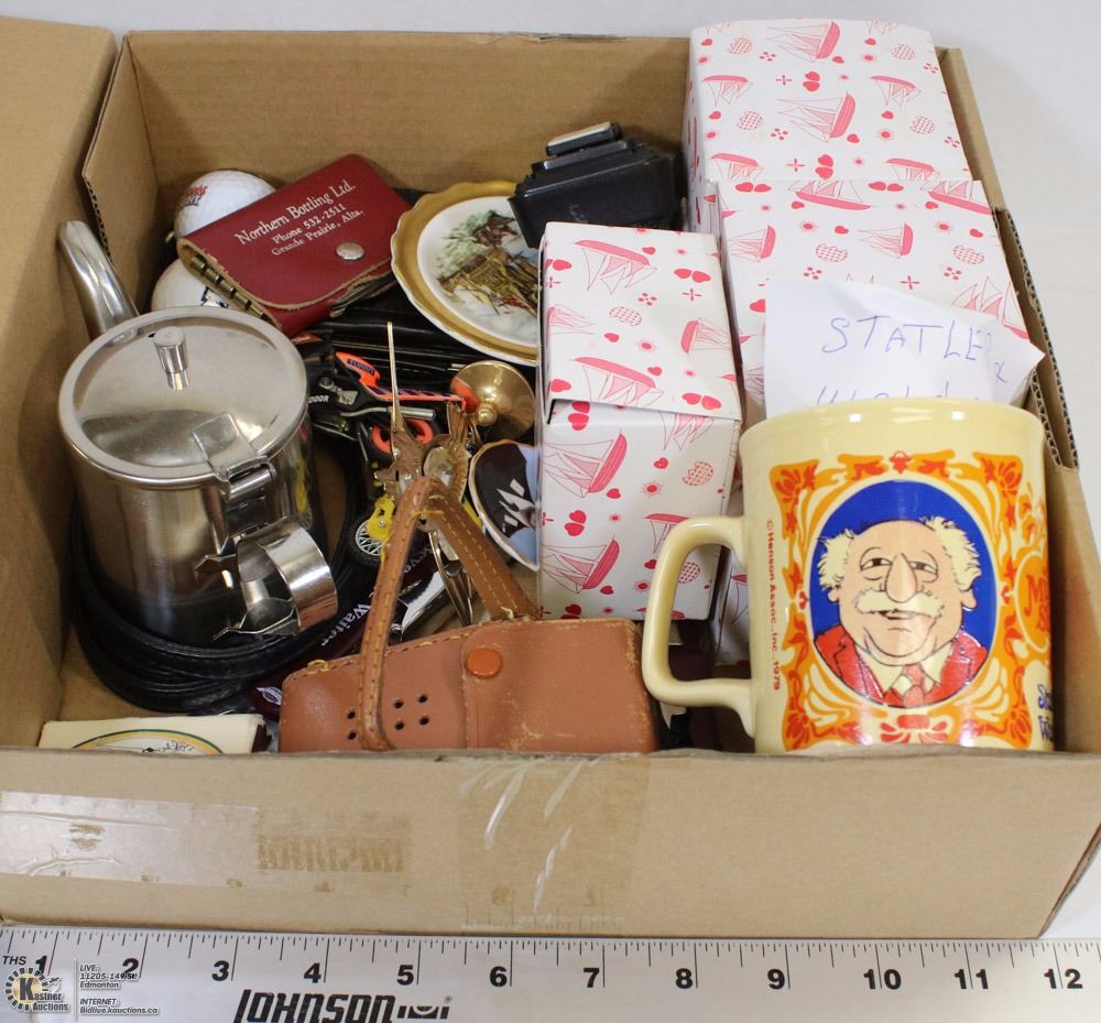BOX WITH ASSORTED COLLECTIBLES AND OTHER ITEMS