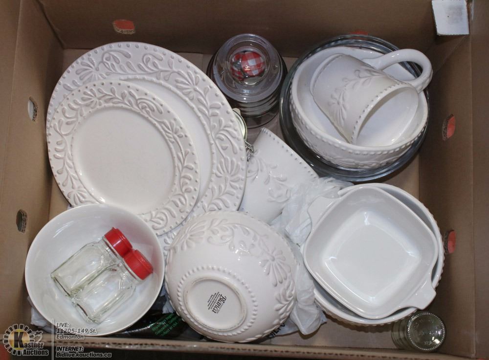 BOX WITH ASSORTED GLASSWARE AND MORE