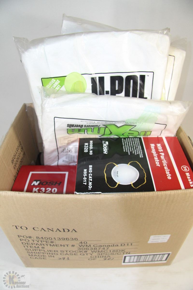 BOX WITH ASSORTED NEW RESPIRATORS AND COVERALLS