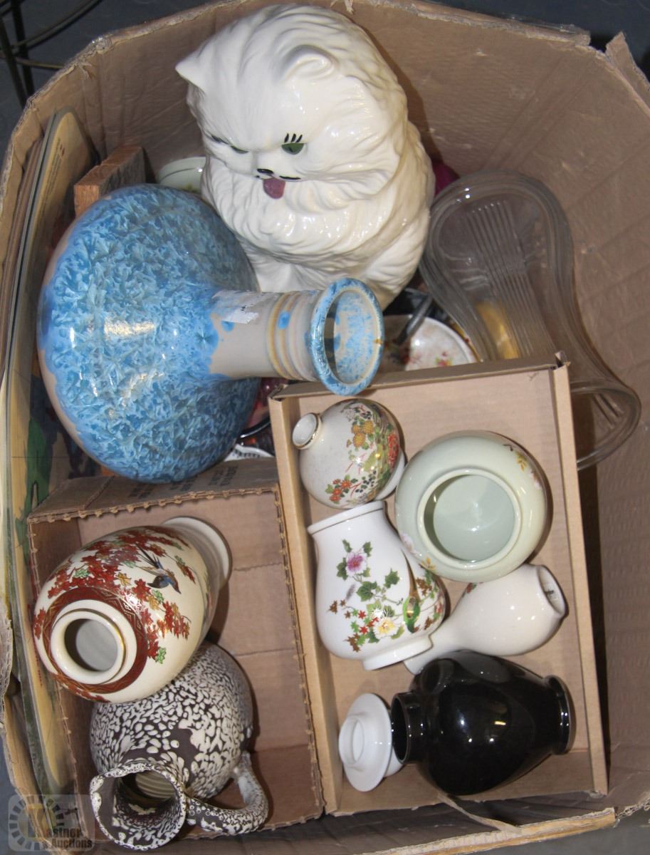 INCLUDING LARGE PORCELAIN WHITE CAT, "PERTH" PLATES, CANDY DISHES, COLORED GLASS DISHES AND MORE