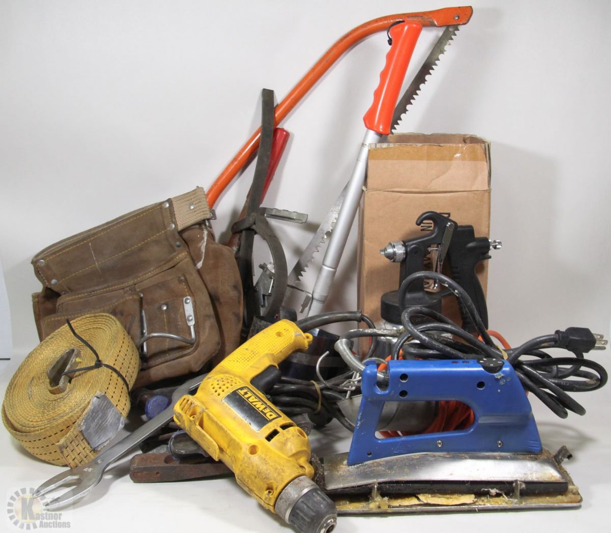 BOX WITH ASSORTED TOOLS, INCL SEAMER,SAW, DRILL