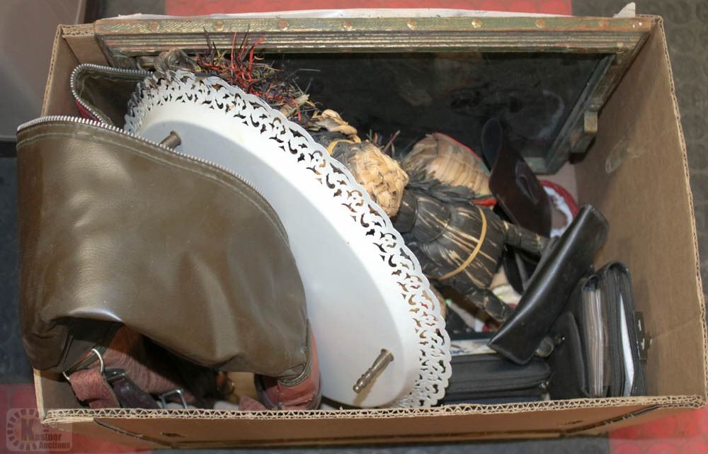 BOX WITH ASST. ORNAMENTS,DAYRUNNERS & GUN CASE